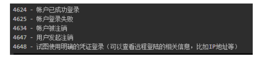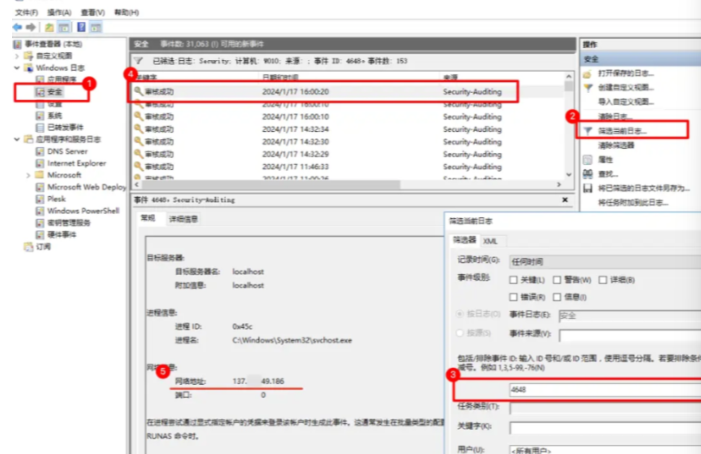 4.登录失败的事件ID为4625,登陆成功的事件ID为4624和4648,可以在下图步骤3中替换不同的ID找到Windows登陆的是日志和IP地址