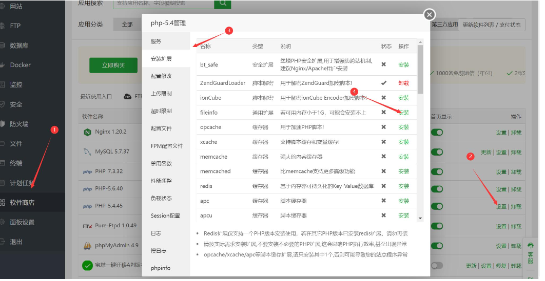 登录宝塔Linux客户端,选择软件管理,点击 安装的PHP 版本 后面的设置,在安装扩展里面选择