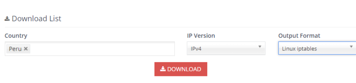 yum install iptables ipset -yservice iptables start我们使用IP2LOCATION这家公司提供的IP地址库。比如我们要屏蔽来自秘鲁的IP,请访问以下地址,选择国家为“秘鲁”,选择输出格式为“Linux iptables”,然后下载iptables规则文件。