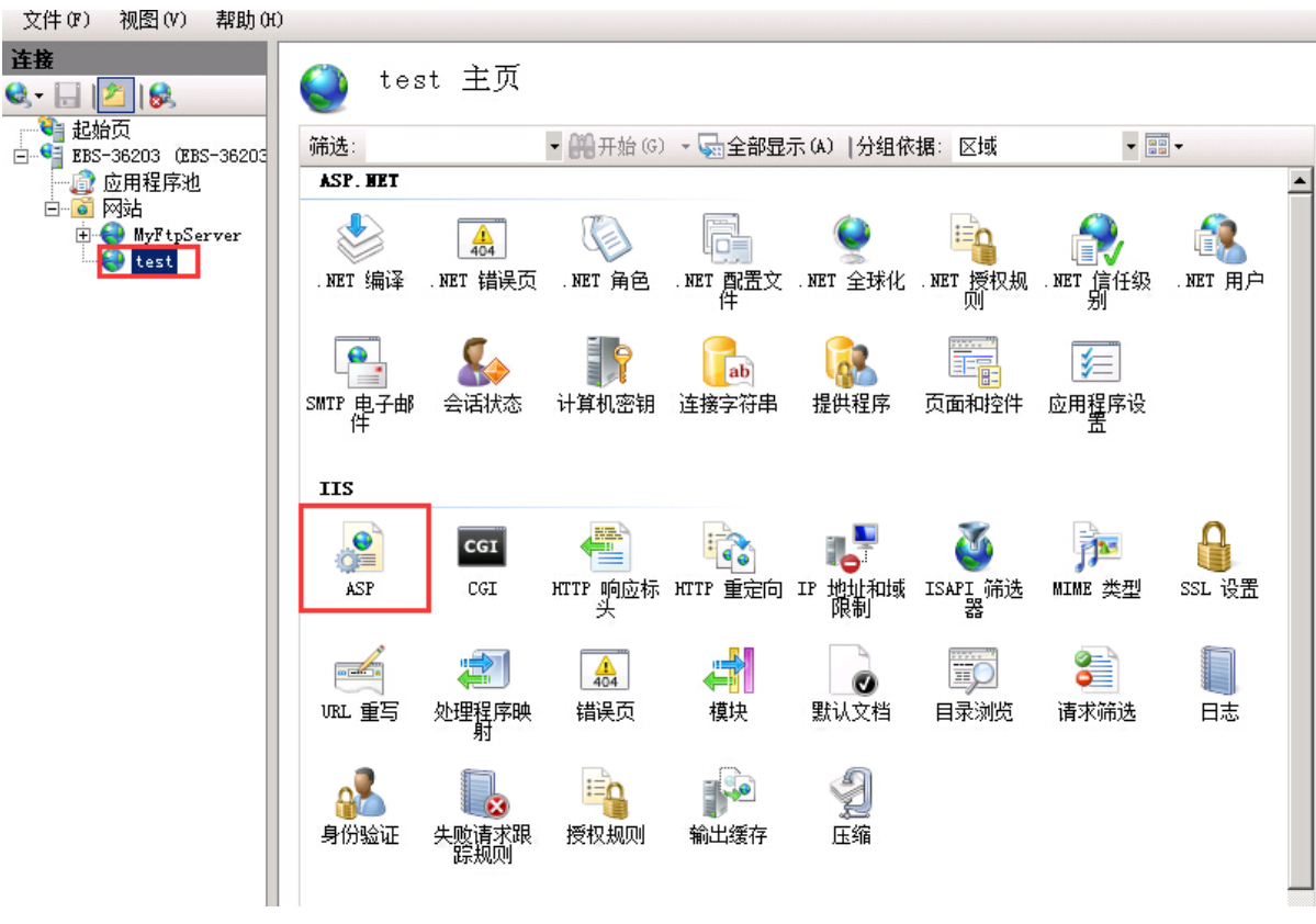 打开IIS管理器,选择需要设置的网站,点击ASP功能项。