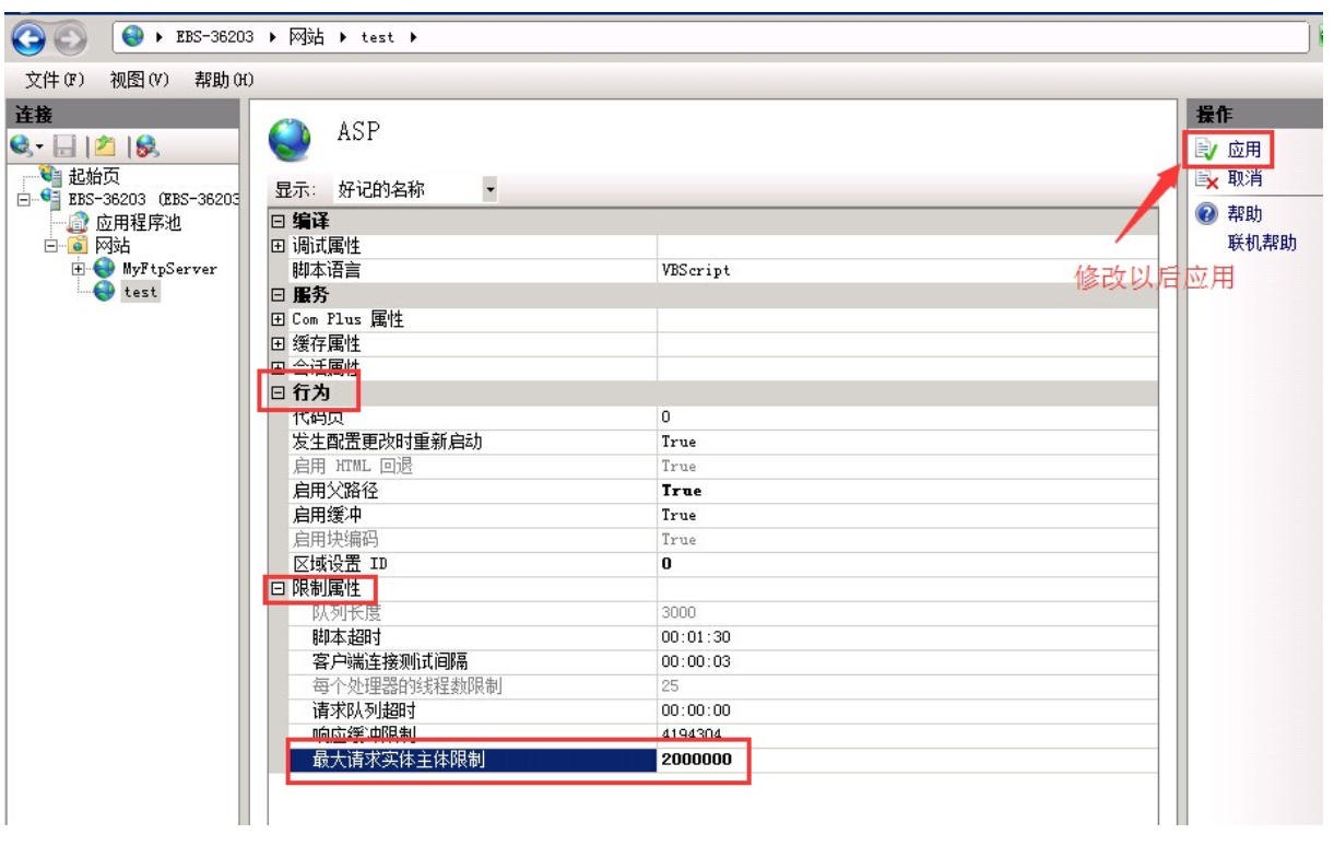 依次展开“行为=》限制属性”,修改“最大请求实体主体限制”的值。以2M为例,这里的值需要乘以1000*1000,即2000000。
