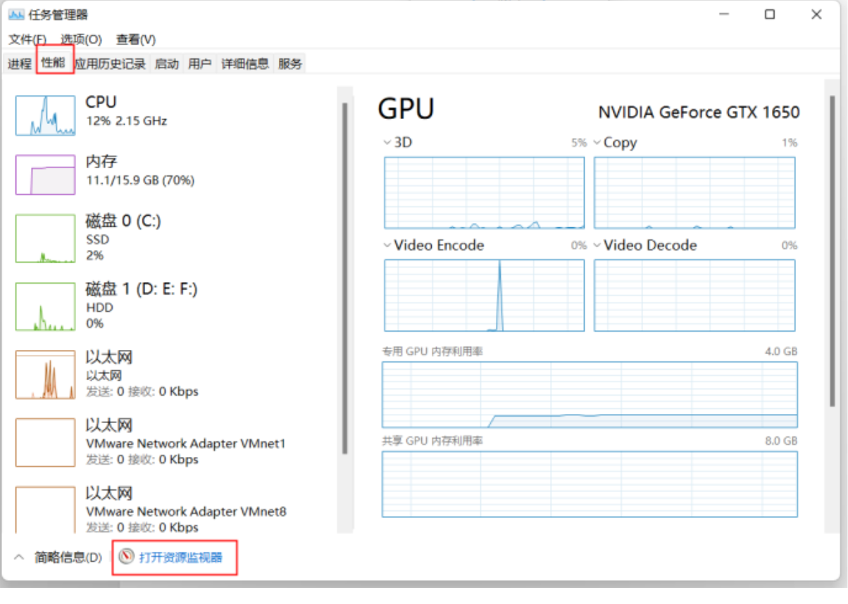 1.打开任务管理器,选择性能选项,然后打开资源管理器。