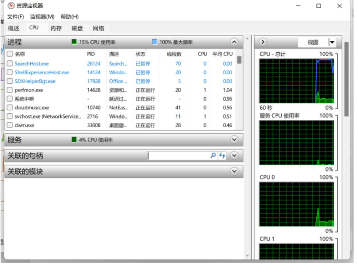 2.看下图,在“资源监视器”界面中,点击第二个选项卡“CPU”。在“关联的句柄”右侧搜索框内输入文件名称,点击右侧下拉箭头,就可以查看该文件被那几个程序占用了