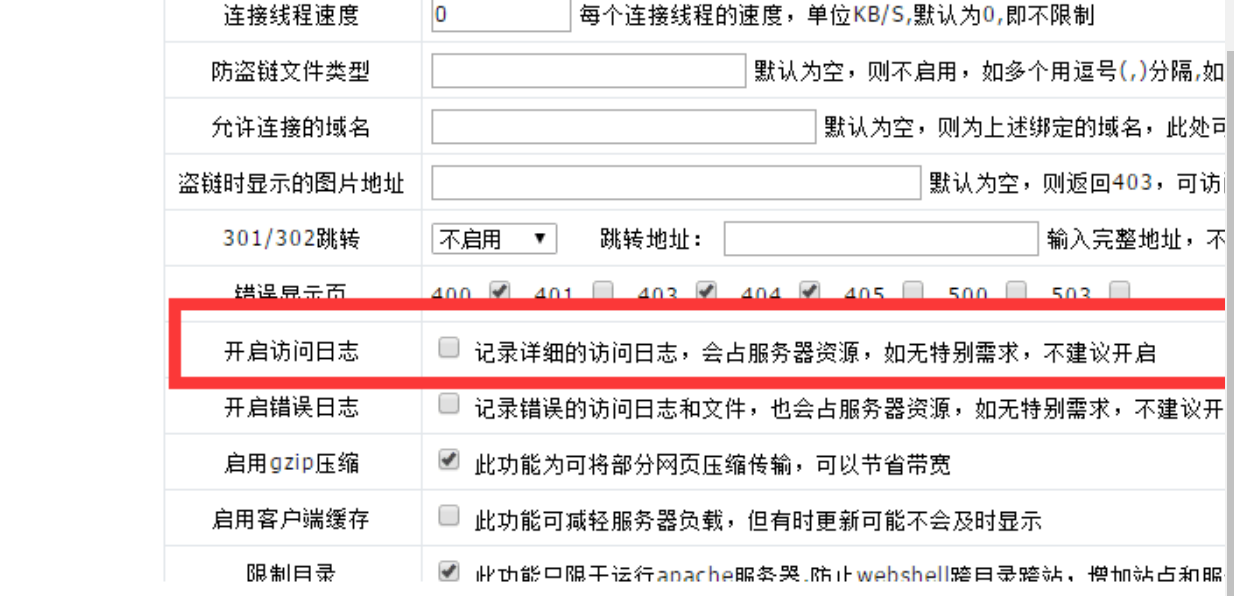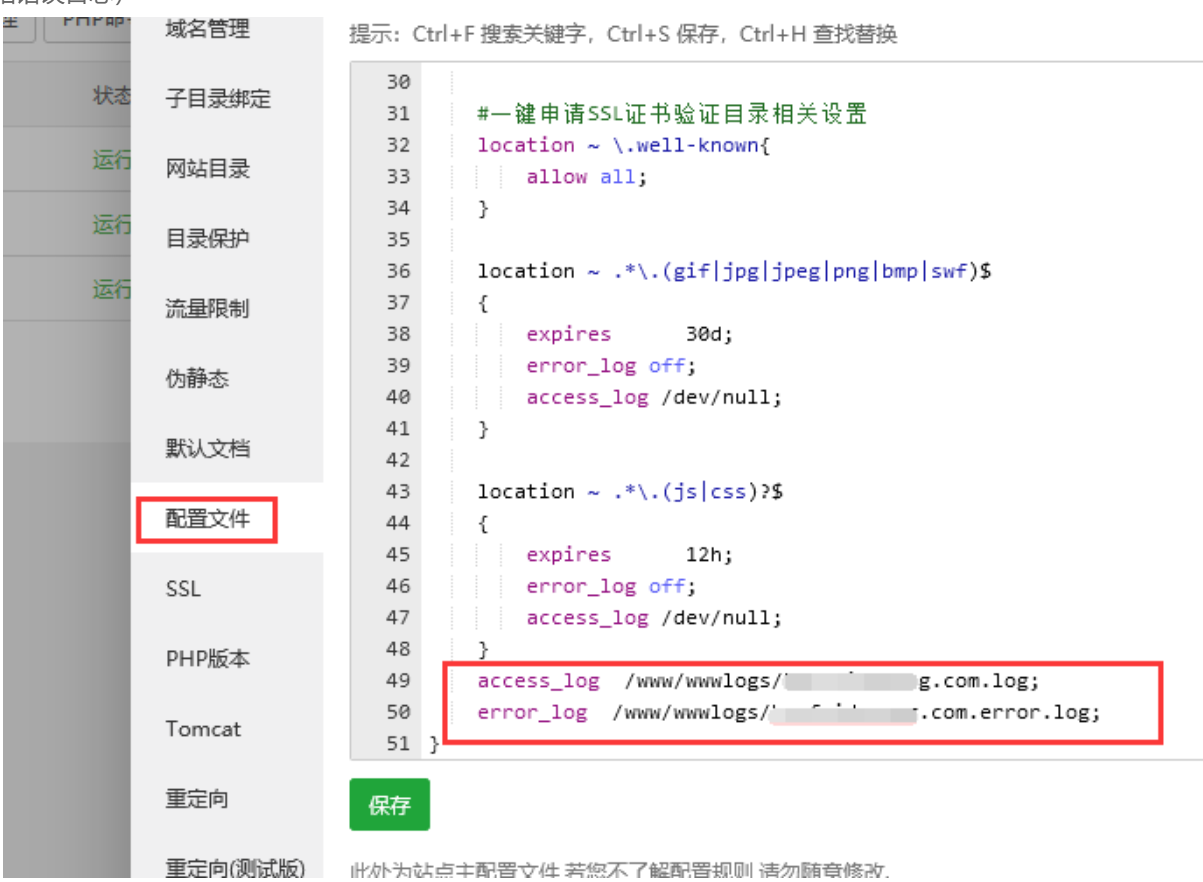 进入BT管理面板中,点击左侧“网站”-对应站点--点击“设置”-配置文件,查看access_log行 (access_log为网站访问日志 ,error_log为网站错误日志)
