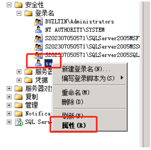 3、右击sa-----属性: