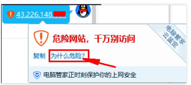 由于IP地址是循环使用的,如果您开通的云服务器,IP地址以前使用过,同时被QQ和腾讯管家拦截提示危险网站,那么现在您新开通此提示同样存在。