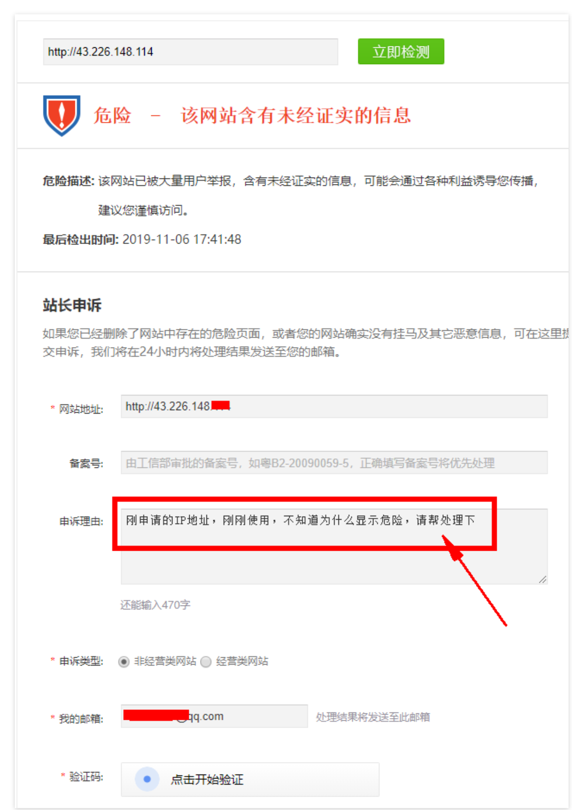 二、点击“为什么危险”按钮,将跳转到,腾讯的申诉页面,如下图: