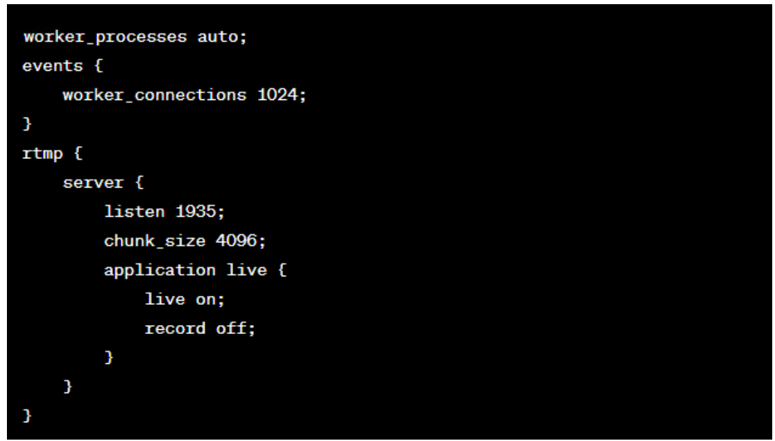 在文件中添加以下内容,这是一个基本的Nginx-RTMP配置示例:
