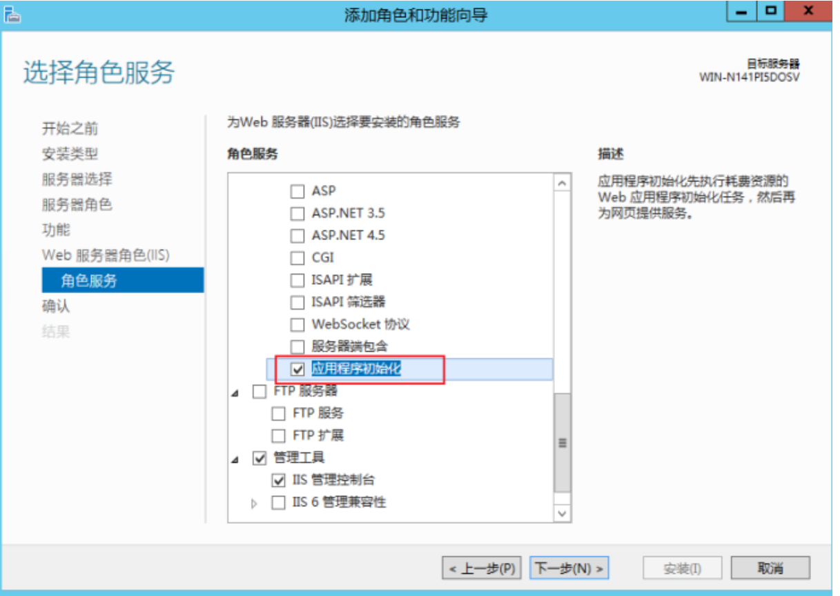 2、弹出“添加角色和功能向导”,在向导中“服务器角色”里选择“应用程序初始化”,右侧显示描述为,应用程序初始化先执行耗费资源的 Web 应用程序初始化任务,然后再为网页提供服务。
