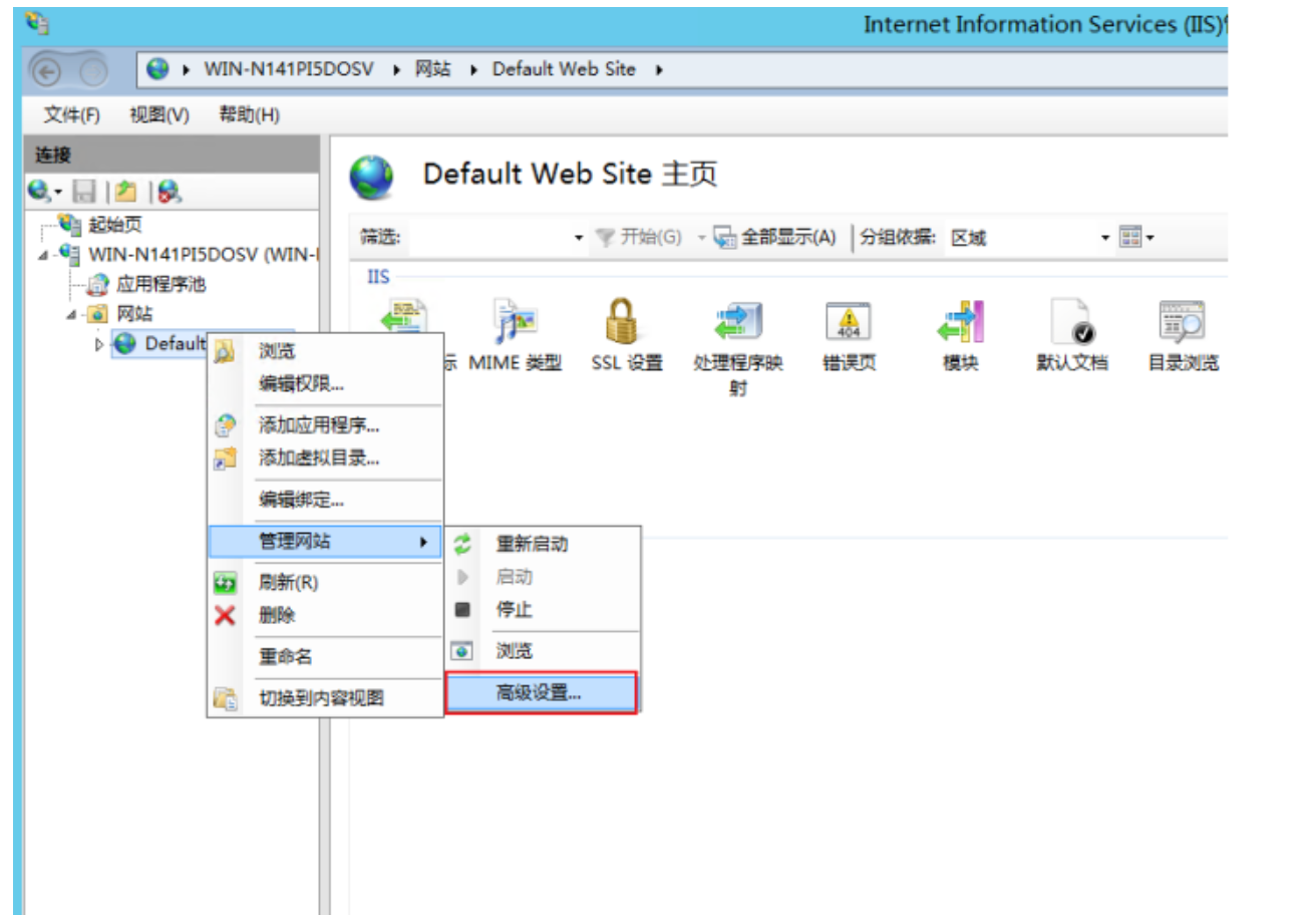 1、打开 IIS 管理器,左侧展开“网站”节点,在网站上鼠标右键选择“管理网站 > 高级设置”。