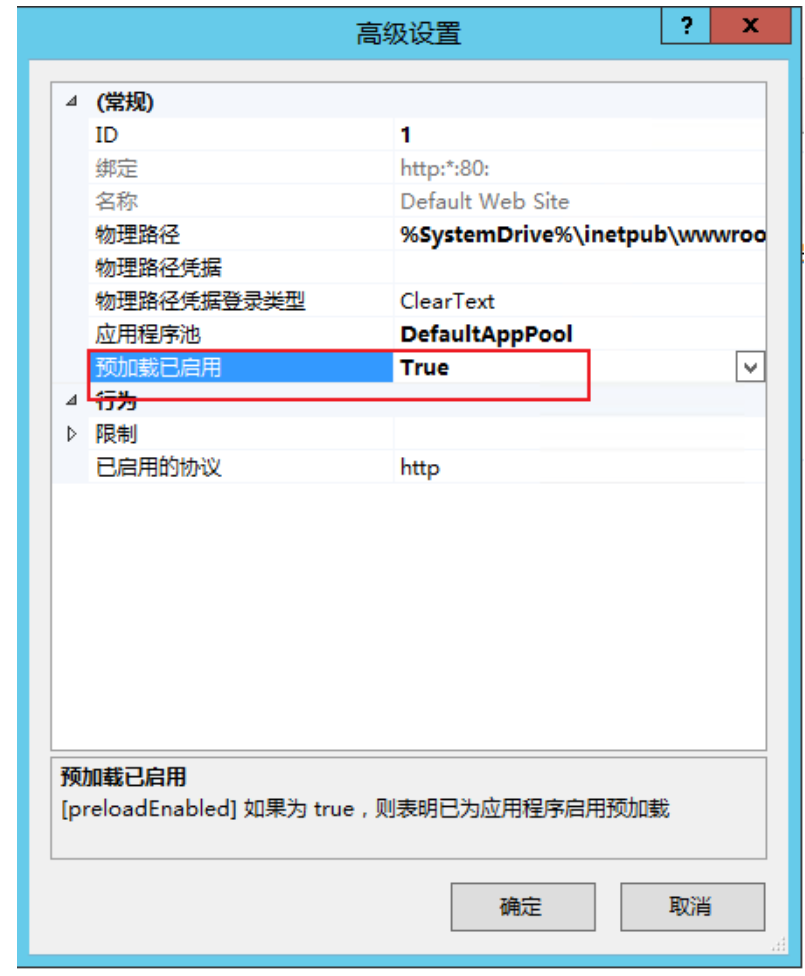 2、在“高级设置”设置“预加载已启用”为“true”。