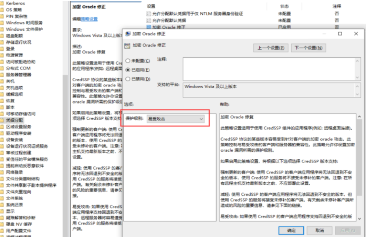 找到该路径:“计算机配置”->“管理模板”->“系统”->“凭据分配” 在右边设置名称找到 “加密 Oracle 修正”,将保护级别更改为“易受攻击”。