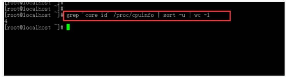 2.输入grep 'core id' /proc/cpuinfo | sort -u | wc -l查看CPU的个核心数。