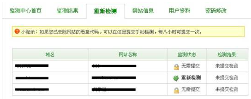 3. 找到需要检测的网站,点击“重新检测”,等待检测结果即可,最新的扫描结果将在最长一个小时内给出。注意:请您在确认自己的网站已经安全的情况下再提交重新检测,如果仍有挂马,请在监测情况栏中查看详细挂马详情。并且可以在8小时之后再次提交系统自动检测。对于回检没有问题的网站,360网盾和360安全浏览器将在15分钟后自动取消风险提示。