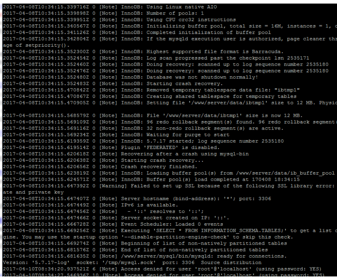 注:mysql挂的原因很大程度是重启服务器所致,没事请不要重启服务器,如修改过配置文件等,重载服务即可无需重启。确实需要重启请使用面板中的安全重启,切勿使用reboot命令。
