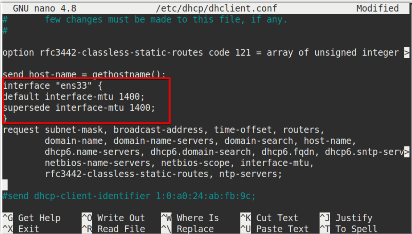 如果DHCP服务器运行在你的系统上,并且网络接口被配置为从它那里接收IP地址,那么使用/etc/dhcp/dhclient.conf文件来改变MTU大小。