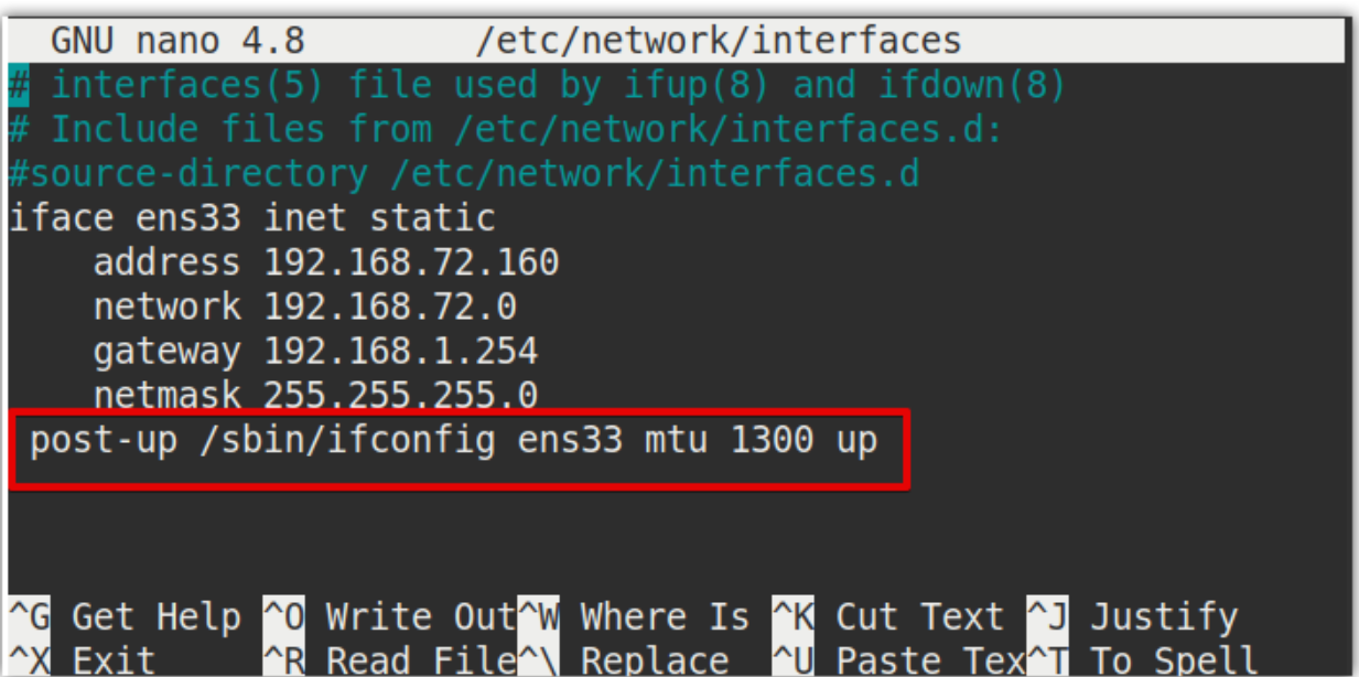 post-up /sbin/ifconfig ens33 mtu 1300 up