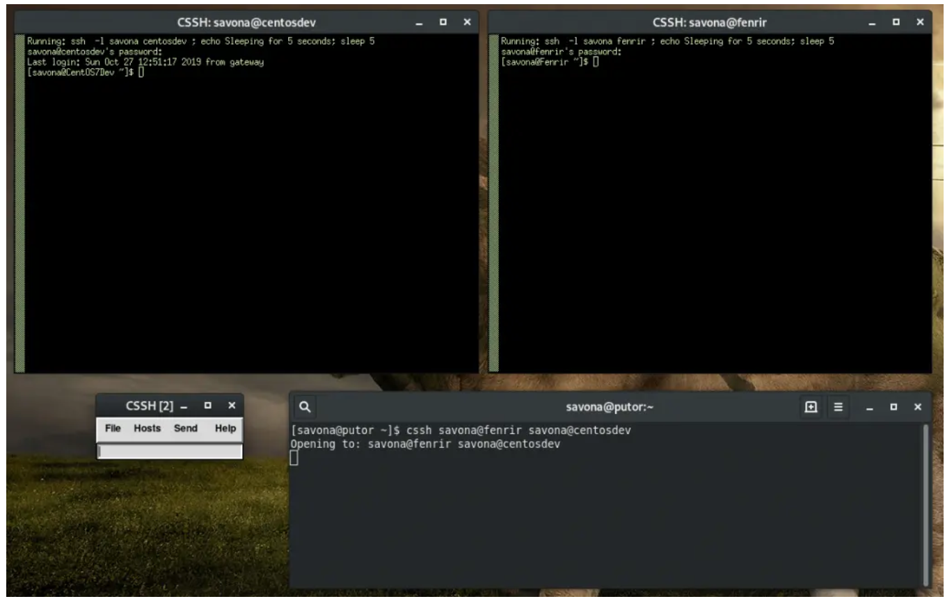 然后,Cluster SSH打开两个XTerm窗口,对于作为参数提供的每个主机,一个窗口。它还打开了一个管理控制台,您可以在其中输入将在XTerm窗口中重复的命令。