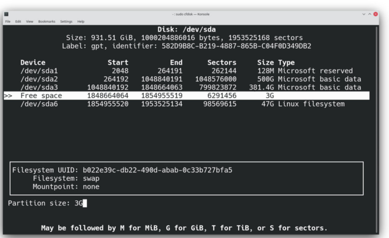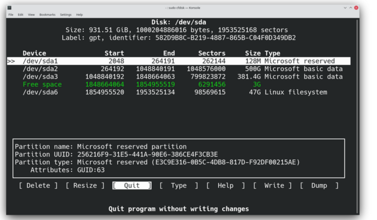 如果/dev/sda是系统的硬盘驱动器(HDD),那么输入cfdisk /dev/sda将允许你只管理HDD上的分区。同样,你也可以键入 cfdisk /dev/sdb 来对连接到系统的外部存储设备进行分区。