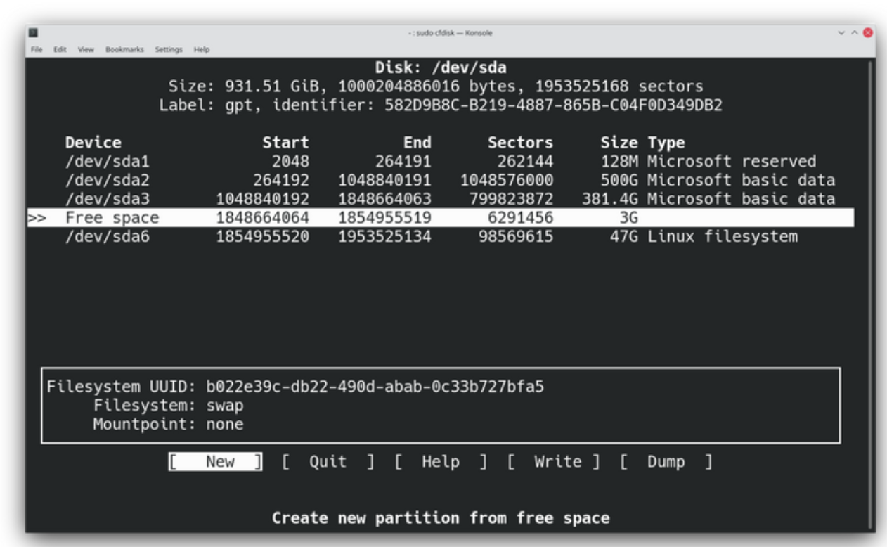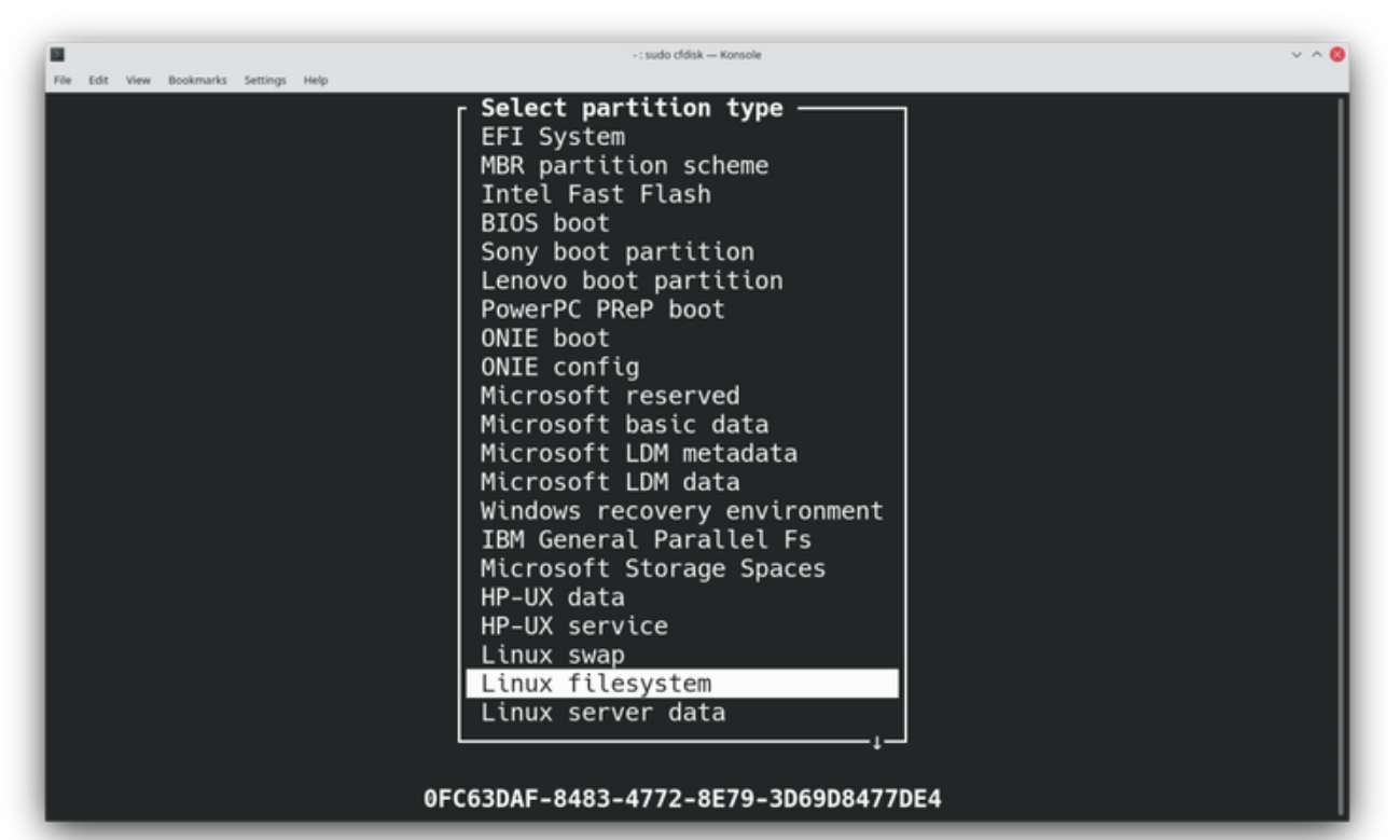 当您在存储设备上创建一个新的分区时,默认的分区类型会被设置为 Linux Filesystem。但是,如果您要将分区用于其他用途,例如 Linux swap 或 EFI,您可以使用 Cfdisk 轻松地更改类型。