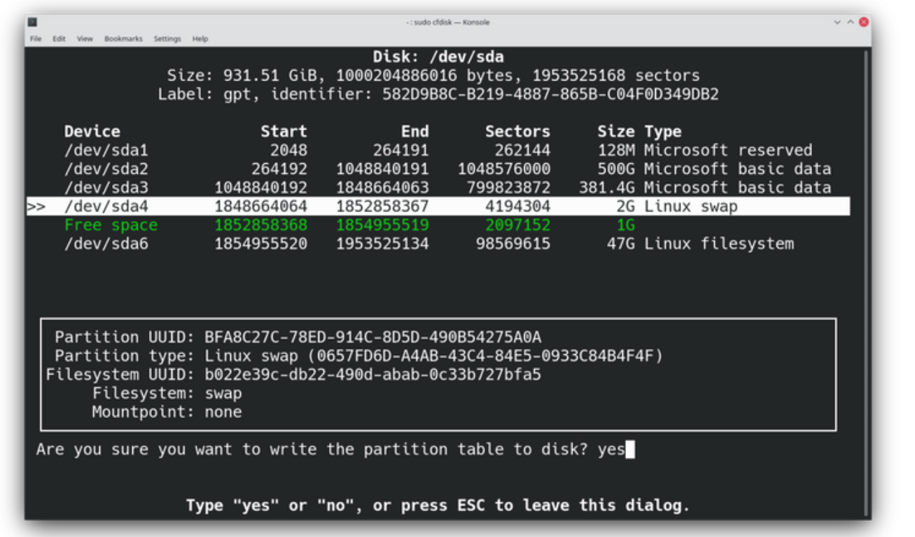 同样,更改分区类型后,需要将更改的内容写入磁盘。从菜单中选择 "Write"写入,然后按Enter键。输入"YES "来完成这个过程。