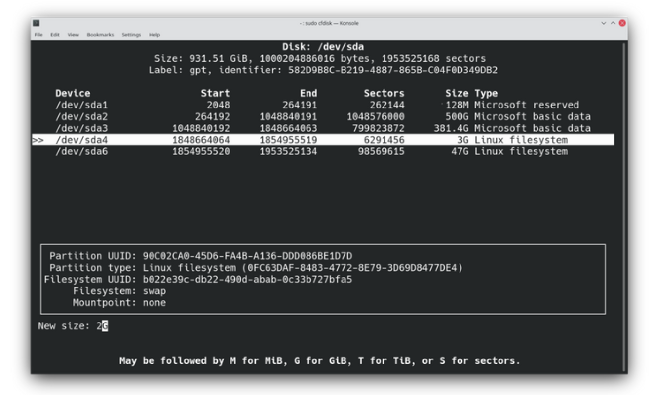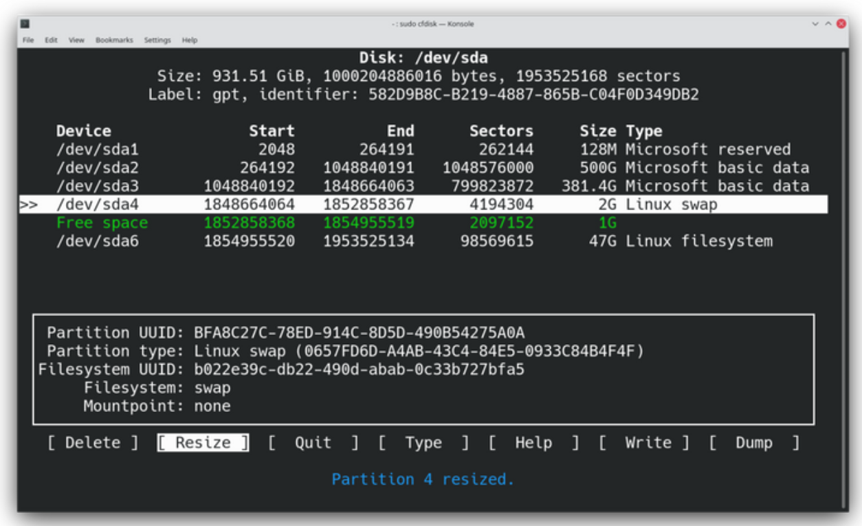 Cfdisk可以让你在几秒钟内改变分区的大小。