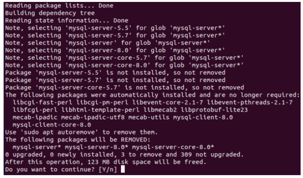 命令 "apt purge "确实删除了二进制文件和配置文件,但是,还有一些MySQL配置文件和数据库文件没有被任何软件包管理器触及。