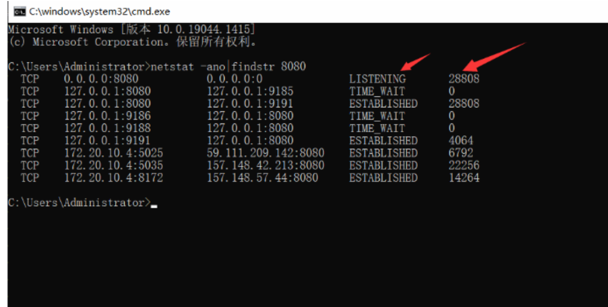 2.比如我们要查找8080端口的pid号,那么在终端中输入netstat -ano | findstr 8080,找到LISTENING那一行,即可看到8080端口号的pid号为28808