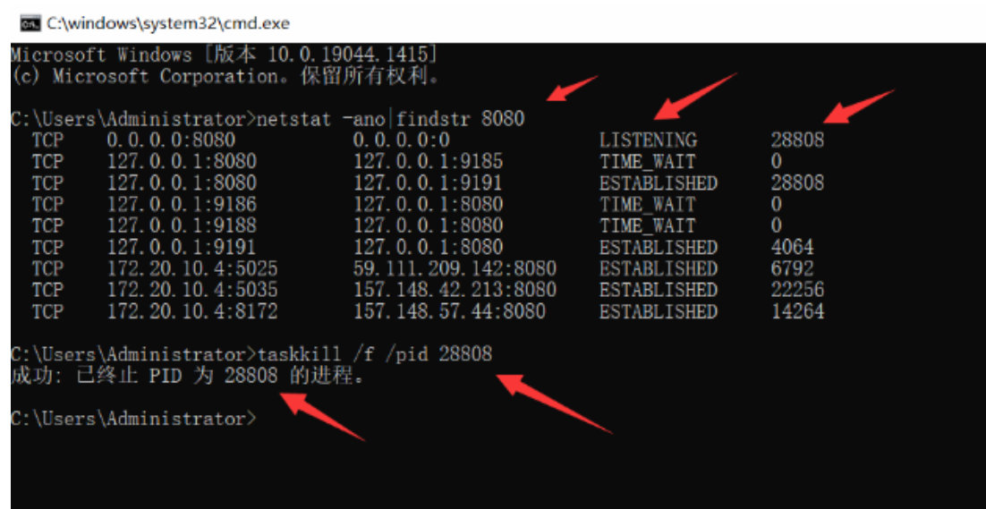 3.终端中输入taskkill /f /pid 28808,按下回车,即可杀死进程,释放端口。