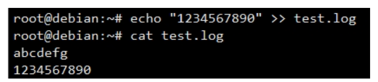 2.echo "1234567890" >> test.log“>>”或”1>>” 追加输出重定向:把前面输出的东西追加到后边的文件尾部,不会清除文件原有的内容。