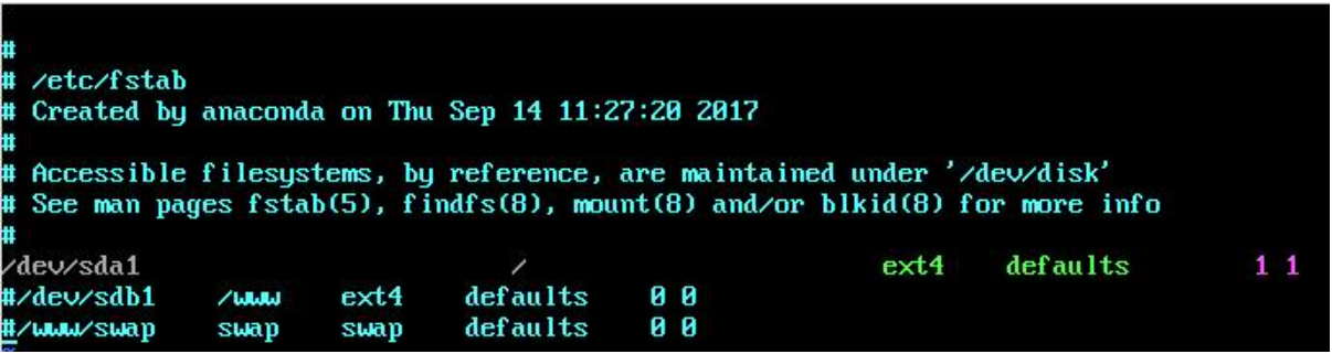 进入fstab文件,在sdb1相关的配置前,手动添加“#”,如上图所示,保存退出,重启服务器