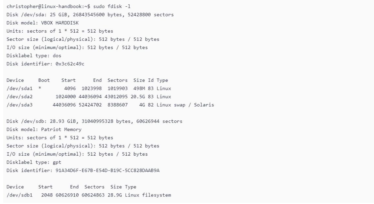您的输出显然会有所不同。在确定所需的驱动器时,请格外小心。如果不确定,请卸载磁盘,然后fdisk -l再次运行命令。如果您拥有正确的设备,则断开连接时不会列出该设备。